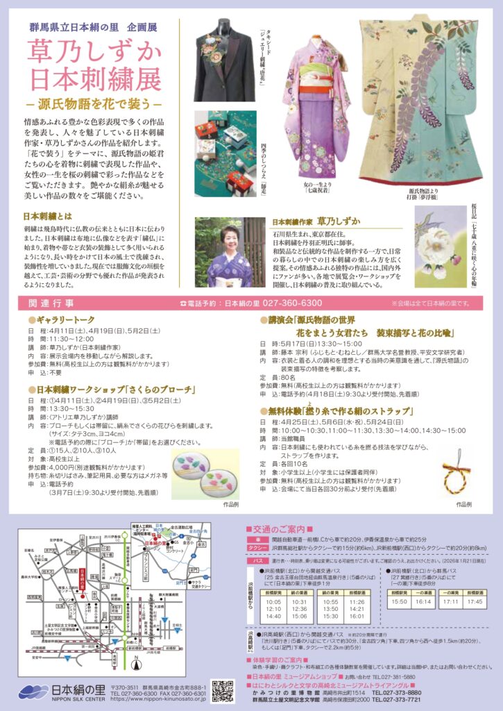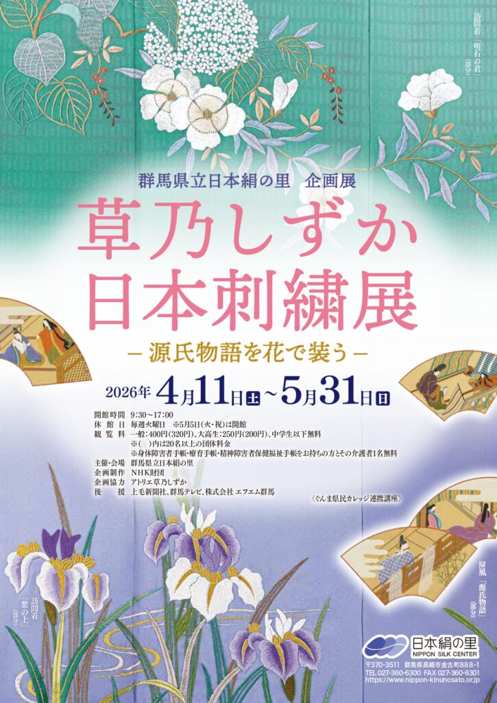 情感あふれる豊かな色彩表現で多くの作品を発表し、人々を魅了している日本刺繍作家・草乃しずかさんの作品を紹介します。「花で装う」をテーマに、源氏物語の姫君たちの心を着物に刺繍で表現した作品や、女性の一生を桜の刺繍で彩った作品などをご覧いただきます。 艶やかな絹糸が魅せる美しい作品の数々をご堪能ください。詳しくはこちらをご覧ください。